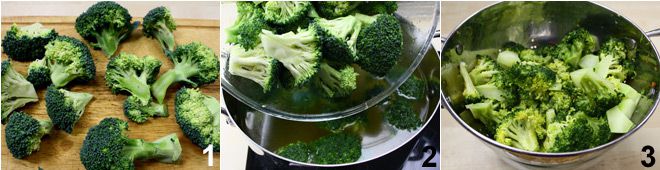 Para preparar los flanes de brócoli, comenzad limpiando los brócolis: separad las florecillas de su tallo 1, luego lavadlas y reservadlas. Pelad los tallos de los brócolis y cortadlos en trozos. Luego, hervid los brócolis en abundante agua hirviendo 2, luego escurrid la verdura y dejadla en un colador, para que desaparezca toda el agua en exceso 3.