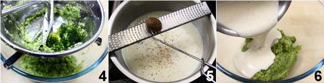 Pasad los brócolis por el pasapurés 4 (excepto algunas florecillas que reservaréis para decorar los platos), recogiendo el puré en un bol. Mientras tanto, preparad la bechamel derritiendo la mantequilla en un cazo, añadiendo la harina, que dejaréis dorar a fuego moderado durante un instante; añadid en este punto la leche y mezclad a fuego lento hasta que la salsa espese, luego añadid la sal y la nuez moscada rallada 5, y apagad el fuego.