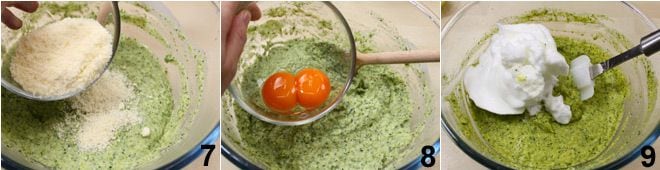 el queso rallado 7 y las dos yemas de huevo 8 (reservad las claras); mezclad los ingredientes, luego ajustad de sal y pimentad. Batid las claras a punto de nieve y agregadlas delicadamente a la mezcla de brócoli con una espátula de goma 9, teniendo cuidado de no desmontar la preparación.