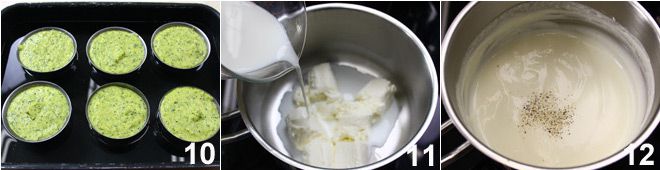 Engrasad los moldes y llenadlos con la mezcla obtenida; poned al fuego una bandeja que pueda contener los moldes y llenadla de agua hasta un tercio de su altura: cuando el agua hierva, apagad el fuego, sumergid los moldes en el baño maría 10 y hornead en horno precalentado a 180°C durante unos 40 minutos. Diez minutos antes de finalizar la cocción, preparad la salsa de queso de cabra: poned el queso en trozos en un cazo a fuego muy bajo y añadid un poco de leche 11, solo lo necesario para derretir el queso de cabra y formar una crema más o menos densa, según gustos. Salpimentad, añadid un poco de pimienta blanca recién molida 12 y mezclad hasta obtener una crema homogénea y sin grumos.