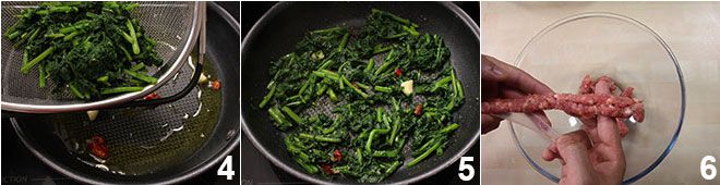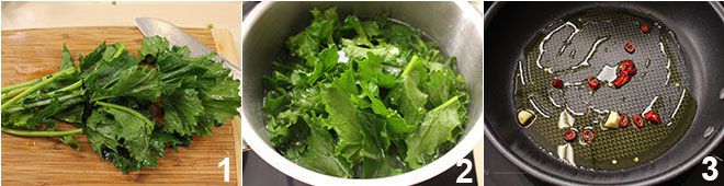Para preparar las focaccias con grelos picantes y salchicha, empieza lavando bien los grelos y eliminando los tallos más duros y las hojas dañadas 1, corta las hojas en trozos y escáldalas durante 5 minutos en agua hirviendo con sal 2. Mientras tanto, prepara una sartén con aceite de oliva virgen extra, un diente de ajo cortado por la mitad y una guindilla picada 3.