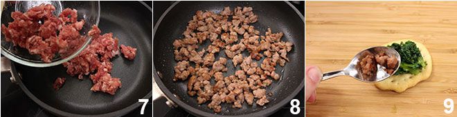 y cocínala en una sartén antiadherente bien caliente 7, dorándola bien 8. Ahora prepara el aperitivo, colocando en cada focaccia una cucharadita de grelos picantes y algunos trozos de salchicha 9: ¡aquí están listas tus focaccias con grelos picantes y salchicha! Si quieres, puedes decorarlas con un trozo de guindilla.