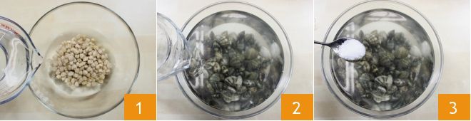 Para preparar la fregola con mejillones, almejas y garbanzos deberás haber puesto a rehidratar los garbanzos durante al menos 12 horas (o una noche entera), en un bol lleno de agua 1. Dedícate entonces a los moluscos, comenzando por las almejas. Ponlas a remojo en agua fría 2 y añade sal gruesa para que se purguen 3. Muéve las almejas con las manos unas contra otras para que eliminen toda la arena posible y déjalas en remojo durante 1-2 horas. Durante este tiempo cambia el agua y la sal gruesa y repite la operación hasta que el agua en el bol esté completamente clara y limpia (para acortar los tiempos, también puedes enjuagar las almejas bajo agua corriente y golpearlas en una tabla de cortar de madera con el corte hacia abajo: si la almeja está limpia se puede cocinar, si sale arena la almeja debe desecharse).