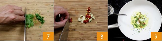 Ahora dedícate al picado que servirá para cocinar los mejillones y las almejas: pica finamente los tallos de perejil 7 previamente lavados bajo agua corriente, luego pica también el ajo y el chile fresco 8. En una sartén amplia, vierte el picado, añade un hilo de aceite 9 y sofríe durante unos segundos.