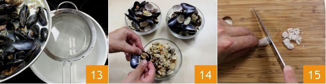 Cuando las valvas estén abiertas, apaga el fuego y filtra el líquido de los moluscos 13, para recogerlo en una olla que habrás llenado previamente con aproximadamente 2 litros de agua. Enciende el fuego bajo la olla y lleva el caldo a ebullición. Mientras tanto deja que los moluscos se enfríen un poco, luego quítales las conchas y recoge los frutos en un bol pequeño 14. Luego procede a limpiar y cortar finamente la chalota 15.
