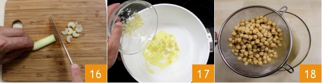 Lava y pela el medio tallo de apio con un pelador o un cuchillo, luego córtalo finamente 16. En una cacerola amplia y honda, vierte un hilo de aceite, añade el picado fino de chalota y apio 17 y sofríe durante 1 minuto. Luego escurre los garbanzos que estarán rehidratados después de las horas de remojo 18.