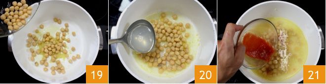 Añade los garbanzos en la cacerola con el sofrito 19, luego rocíalos con el caldo obtenido con el agua de cocción de los moluscos, hasta cubrirlos 20. Añade luego el puré de tomate 21, mezcla y cocina a fuego lento todo durante al menos 1 hora y 40 minutos, añadiendo de vez en cuando el caldo si tienden a secarse demasiado.