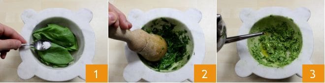 Para preparar la tortilla con pesto y tomates, comienza con el pesto genovés (si ya tienes pesto casero puedes usarlo en la cantidad indicada). Para consultar el procedimiento completo puedes hacer clic en la ficha de la Escuela de cocina que encuentras aquí: Pesto alla Genovese. Reduce el diente de ajo a crema machacándolo en un mortero (si no lo tienes, puedes usar la batidora). Luego añade las hojas de albahaca 1 junto con una pizca de sal gruesa. Machaca las hojas de albahaca con el mortero contra las paredes, girando el mortero de izquierda a derecha y simultáneamente el mortero en el otro sentido 2. Cuando las hojas liberen el líquido verde brillante, añade los piñones y continúa machacando. Luego agrega los quesos rallados poco a poco, continuando machacando; finalmente vierte el aceite de oliva virgen extra poco a poco 3. Mezcla los ingredientes. Ahora que el pesto está listo, resérvalo cubierto con papel film.