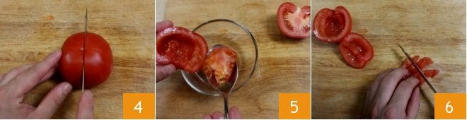 Dedícate entonces a preparar los tomates. Lávalos bajo agua corriente, luego corta uno en cubos: elimina el tallo y córtalo por la mitad 4, luego ahueca el interior con una cucharita para eliminar las semillas 5. Después obtén cubos de la pulpa 6 y consérvalos en un bol.