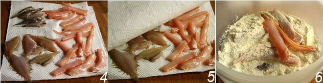 Si es necesario, enjuagad rápidamente bajo el agua corriente los pescados 4, secadlos muy bien con papel de cocina para que queden perfectamente secos 5 y pasadlos por la harina de sémola de grano grueso 6.