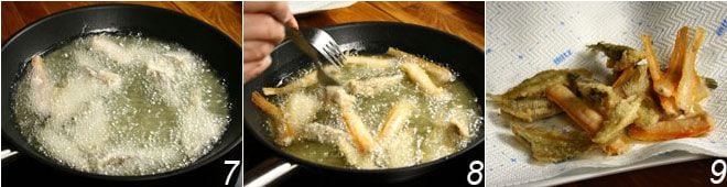 Freíd los pescados en abundante aceite de semillas 7 (mejor si es de cacahuete) que deberéis mantener a la temperatura constante de 175° sin sobrepasarla. Girad los pescados durante la fritura 8 y una vez dorados, escurridlos y colocadlos sobre papel de cocina 9 para eliminar el exceso de aceite. Salar y servir inmediatamente acompañando la fritura con una ensalada mixta o con deliciosas patatas fritas.