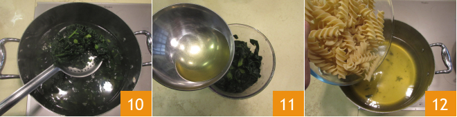 Cuando la col negra esté cocida, escúrrela 10 conservando el agua de cocción y viértela en un vaso alto, agrega un poco de agua de cocción 11 y tritura con una batidora de mano. Cuece los fusilloni en el mismo agua donde has cocido la col negra, después de hacer que vuelva a hervir 12.