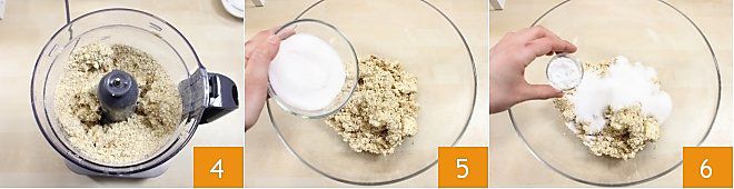 Después de triturar todo 4, cuando la mantequilla esté bien distribuida, retira la mezcla obtenida del robot y colócala en un bol grande. Ahora añade el azúcar 5, la levadura química en polvo 6,