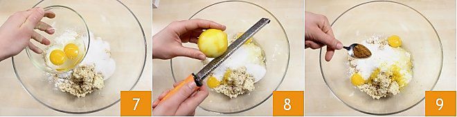 un huevo entero y una yema 7, la ralladura de un limón 8 y una cucharadita de canela 9.