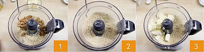 Para preparar las galletas de copos de avena, comienza triturando la mitad de los copos de avena (150 gr) con las almendras 1. Una vez triturados de manera homogénea 2, añade la mantequilla ablandada 3.