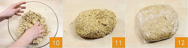 En este punto, añade también los copos de avena restantes (los que no están triturados) y trabaja bien todos los ingredientes con las manos 10. Cuando obtengas una mezcla homogénea 11, cúbrela con papel film y déjala reposar en la nevera durante 30 minutos 12.
