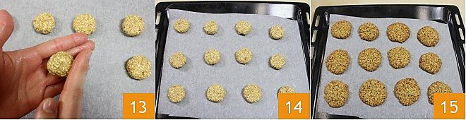 Cuando la masa haya alcanzado la consistencia adecuada (debe estar bastante dura), divídela en muchas pequeñas partes de 15 gr cada una. Con las manos húmedas, haz muchas bolitas 13 y colócalas en una bandeja forrada con papel de horno una al lado de la otra, asegurándote de dejar un espacio adecuado entre una bolita y otra ya que durante el horneado crecerán y se expandirán 14. Hornea a 180° durante 20 minutos (si es ventilado a 160° durante unos 15 minutos), luego retira las galletas de copos de avena del horno tan pronto como estén bien doradas 15. ¡Tus galletas de copos de avena están listas!