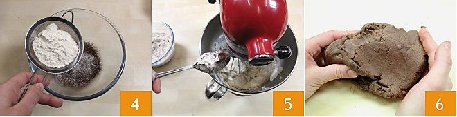 En un bol aparte tamiza la harina y el cacao en polvo 4. Luego, coloca la pala en la batidora y añade poco a poco la harina mezclada con el cacao en polvo 5. Amasa hasta obtener una mezcla compacta, que transferirás a una superficie de trabajo 6.