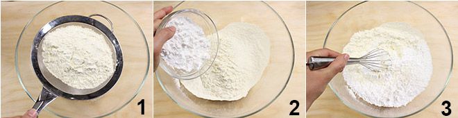 Para preparar las galletas tipo krumiri, precalentad el horno a 200°, tamizad la harina 0 dentro de un bol grande 1, luego añadid el azúcar glas 2, la pulpa extraída de la vaina de vainilla y una pizca de sal: mezclad bien todos los ingredientes utilizando una batidora de varillas 3.