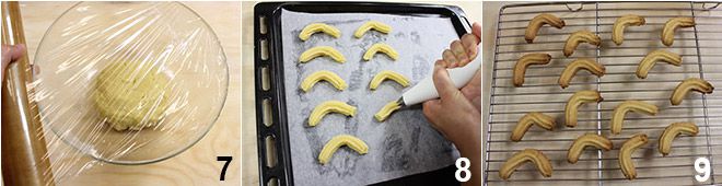 Formad una bola, cubridla con film transparente 7 y dejad reposar durante media hora a temperatura ambiente. Pasado el tiempo necesario, llenad con la masa obtenida una manga pastelera de tela (o una jeringa de plástico) con boquilla estrellada, poniendo poca masa a la vez y siempre suavizándola con las manos. En una bandeja de horno cubierta con papel de hornear, formad galletas en forma de media luna, de unos 7-8 cm de largo 8. Hornead todo a 200° durante 16 minutos, o hasta que las galletas estén doradas; una vez listas las galletas tipo krumiri, dejad que se enfríen sobre una rejilla 9.