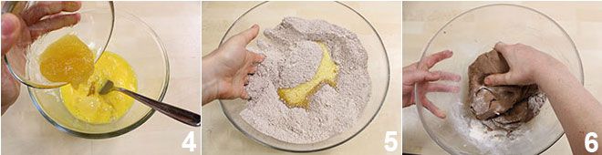 Bate el huevo con la yema y añade la miel 4, mezcla y une la mezcla a las harinas 5. Amasa con las manos hasta obtener una mezcla sólida y compacta, similar a una masa quebrada 6.