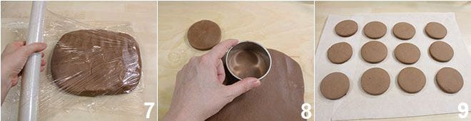Déjala reposar en el frigorífico por al menos 30 minutos, cubierta con película plástica 7. Pasado este tiempo, extiende la masa a un grosor de aproximadamente medio cm y saca 24 círculos de un diámetro de 8 cm 8. Colócalos en una bandeja de horno forrada con papel de horno y hornéalos a 180° por aproximadamente 18-20 minutos 9.