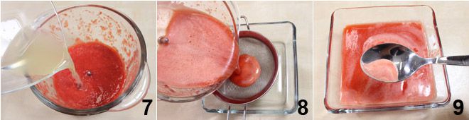 y el zumo de medio limón previamente filtrado 7. Mezcla bien, filtra la mezcla obtenida con un colador de malla fina 8 y, si se ha formado espuma, elimínala con una cuchara 9.