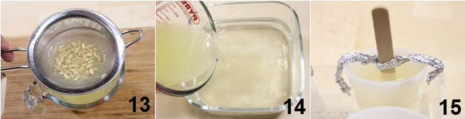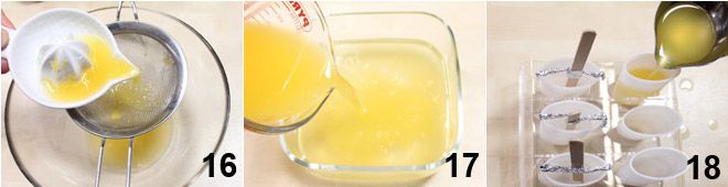 Para preparar los polos de limón, comienza preparando el jarabe, utilizando el mismo procedimiento descrito anteriormente. Mientras el jarabe se enfría, exprime los limones hasta obtener 150 gr de zumo, filtra con un colador de malla fina 13 y añádelo al jarabe ya frío 14. Repite la operación del palito también para los polos de limón, vierte el líquido en los moldes 15 recordando dejar 1 cm de espacio del borde. Ponlos en el congelador hasta que hayan alcanzado una consistencia sólida.