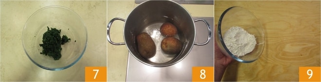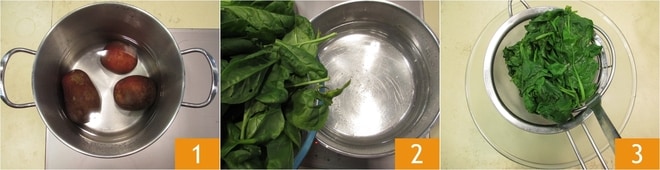 Para realizar los gnocchetti verdes, comiencen cocinando las patatas. Elijan todas del mismo tamaño y colóquenlas en una olla con agua fría 1. Cocinen desde que hierva durante 30-40 minutos. Mientras tanto, cocinen las espinacas. Sumérjanlas en agua hirviendo, ligeramente salada 2 y cocínenlas durante unos 5 minutos, hasta que estén marchitas. Transfiéranlas a un colador, colocado sobre un bol 3.