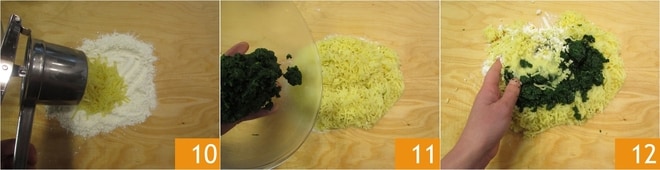 Trituren encima las patatas 10 y añadan también las espinacas 11. Ahora amasen rápidamente con las manos 12.