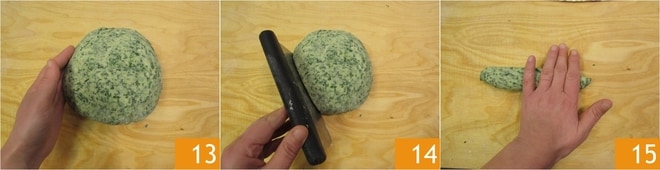 Deben obtener una masa homogénea 13. Tomen una porción utilizando un cuchillo o una espátula 14 y con las manos formen un cilindro sobre la superficie de trabajo 15; debe tener un grosor de unos 2 cm.