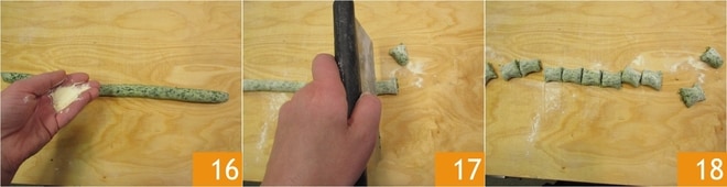 Utilizando la sémola, enharinen bien el cilindro de masa 16, luego usando siempre la espátula (o un cuchillo) corten trozos de 1,5 cm de ancho 17 18. Añadan un poco más de sémola para que no se peguen.