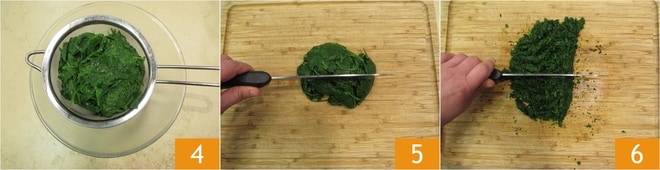 Escúrranlas bien 4 y trasládenlas a una tabla de cortar 5; luego píquenlas finamente con un cuchillo 6.