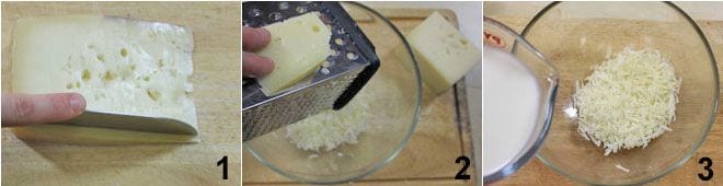 Para preparar los ñoquis con crema de Asiago, comienza preparando la crema: toma el Asiago y quita la corteza 1, rállalo 2 y ponlo a macerar en la leche durante 20 minutos 3.