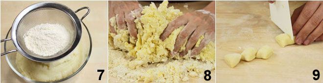luego añade la harina tamizada y una pizca de sal 7. Transfiere la masa a una superficie de trabajo para manejarla más fácilmente y amasa hasta obtener una mezcla homogénea (si es necesario, añade más harina a la mezcla para facilitar el trabajo) 8. En este punto, deja reposar la masa a temperatura ambiente durante 10 minutos. Pasado el tiempo necesario, divídela en muchos cilindros y corta trozos de 2-3 centímetros de grosor 9,