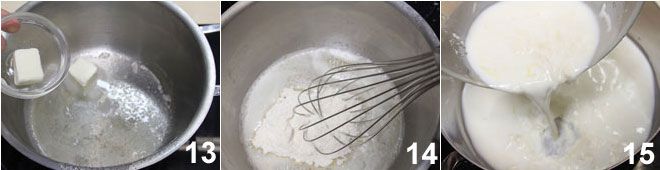 Mientras tanto, toma un cazo, derrite la mantequilla 13 e incorpora la harina con la ayuda de una batidora de varillas 14. Cuando la mezcla de Asiago y leche haya alcanzado el punto de ebullición, añádela a la mantequilla y continúa mezclando, siempre utilizando la batidora, para amalgamar todos los ingredientes 15. Tan pronto como la crema se espese o vuelva a hervir, retírala del fuego. En este punto, pruébala y, si es necesario, ajusta la sal.