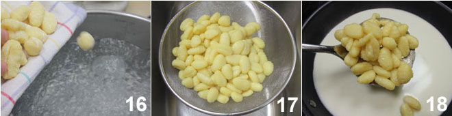 luego comienza a formar tus ñoquis con la ayuda del utensilio para ñoquis 10, finalmente colócalos sobre una superficie o bandeja enharinada antes de cocerlos 11. En este punto, toma el Asiago con la leche y ponlo en un cazo, luego llévalo a ebullición 12.