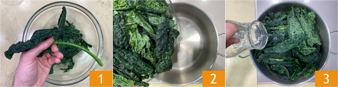 Para preparar los gnudi de col negra, lo primero que hay que hacer es limpiar el col negra: separar las hojas de los tallos 1, luego poner las hojas en una olla grande 2 con poca agua 3.