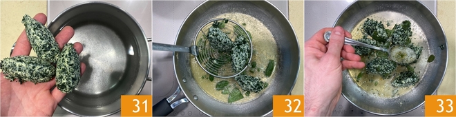 Sumergir los gnudi en el agua a ligero hervor, teniendo cuidado de manejarlos con atención ya que son muy suaves y delicados 31. Después de escaldarlos, escurrir delicadamente los gnudi y trasladarlos a la sartén con el condimento 32. Dejarlos sazonar a fuego lento durante unos minutos, bañándolos con la mantequilla aromatizada 33.