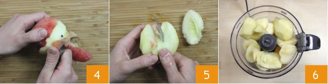Mientras tanto, pela los melocotones 4, retira el hueso, córtalos en rodajas 5 y colócalos en una batidora 6.