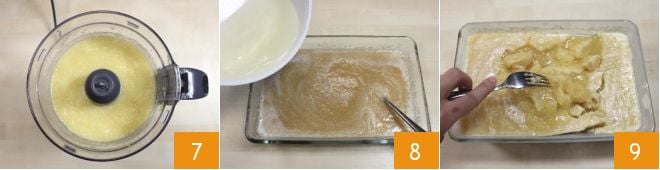 Tritura las rodajas de melocotón hasta obtener una mezcla lisa 7. Luego, transfiere el puré de melocotón a un recipiente ancho con bordes bajos para facilitar la congelación, y agrégale el jarabe ya frío 8. Mezcla todo y ponlo en el congelador. Pasados 30 minutos, rompe los cristales de hielo formados con los dientes de un tenedor 9.