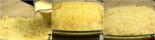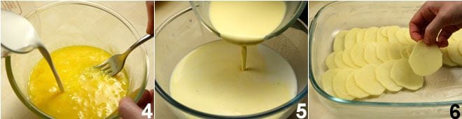 Retira del fuego la leche aromatizada, elimina el diente de ajo y deja que se enfríe. Mientras tanto, bate los huevos en un recipiente y añádelos la nata 4. Finalmente añade la mezcla a la leche que habrás dejado enfriar 5 y mezcla bien. Ajusta eventualmente de sal y pimienta. Unta con mantequilla una fuente para horno y comienza a colocar una capa de patatas 6.