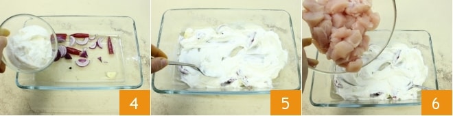 luego en una fuente colocad 1 diente de ajo, la mitad de la cebolla roja picada, el chile y el yogur griego 4. Mezclad con un tenedor para integrar bien los aromas 5. Verted los trozos de pollo en la salsa 6, salpimentad,
