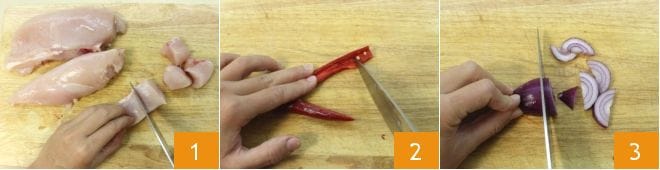 Para realizar el guiso de pollo al yogur, comenzad cortando la pechuga de pollo en trozos de unos 2 cm de grosor 1. Luego ocupáos de la marinada: cortad el chile en tiras y eliminad las semillas 2, cortad finamente la cebolla 3