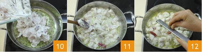 agregad el pollo junto con su salsa de marinada (10-11), dejad dorar por 10 minutos y luego aromatizad la preparación con nuez moscada rallada 12, condimentad con pimienta y sal al gusto,