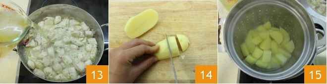 cubrid el pollo con el caldo 13 y dejad cocer a fuego lento durante 1 hora cubriendo la cacerola con una tapa. Mientras tanto, preparad las patatas al perejil que servirán de guarnición: pelad y lavad las patatas, cortadlas en trozos 14, escaldadlas en agua hirviendo con sal durante 5 minutos. Escurridlas 15