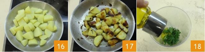 y salteadlas en una sartén 16 por otros 5 minutos hasta que estén crujientes y doradas 17. Ahora preparad la salsa de perejil que servirá para sazonar las patatas: En un pequeño procesador poned el perejil con el aceite 18