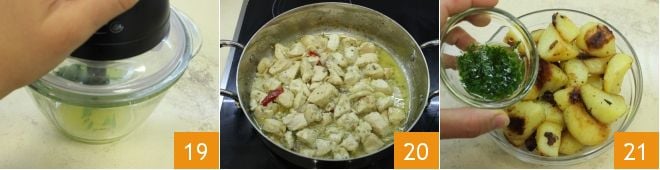 Activad el procesador por unos instantes 19, el tiempo necesario para emulsionar la mezcla, ajustad la salsa de sal y pimienta. Si no disponéis del procesador, podéis picar el perejil a cuchillo y luego emulsionar con el aceite ayudándoos con un batidor. Mientras tanto, el guiso de pollo al yogur estará listo 20 servidlo bien caliente con las patatas sazonadas con la salsa de perejil 21.