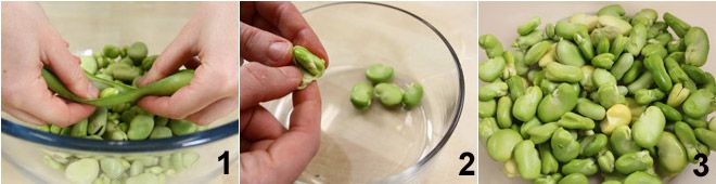 Para preparar las habas a la menta, comience lavando las habas, luego quíteles su vaina 1, desgránelas haciendo un corte en el lado del ojo y presionando para sacar la semilla 2 y póngalas a un lado.