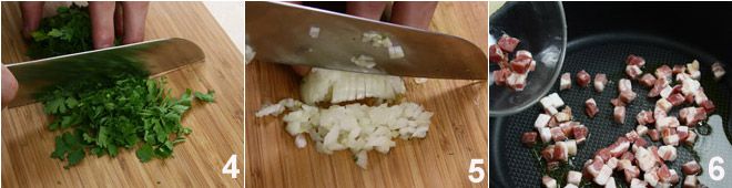 Pique finamente el perejil 4 y la cebolla 5. Tome una sartén grande, caliente dos cucharadas de aceite y luego agregue los cubitos de panceta 6,